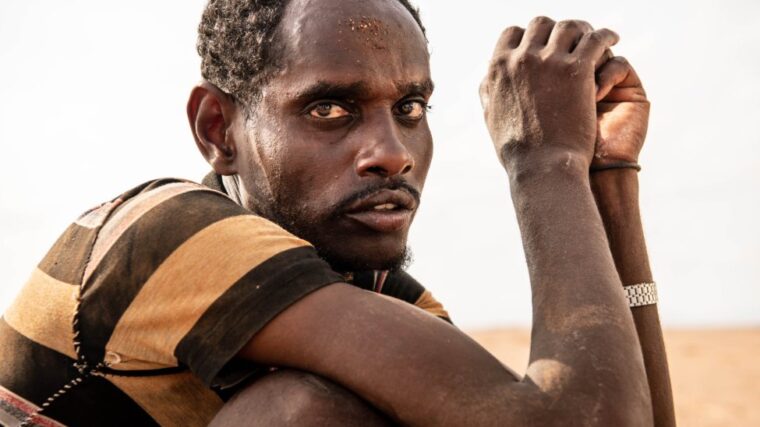 Omar, un migrant éthiopien, est pris en charge par l’unité mobile de l’OIM pour déshydratation …