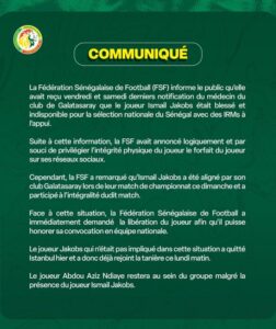 La Fédération Sénégalaise de Football (FSF) a informé le public de l’étrange situation concernant le joueur Ismail Jakobs. Le club de Galatasaray avait notifié la FSF que Jakobs, blessé, était indisponible pour la sélection nationale avec des résultats d’IRM à l’appui. Par conséquent, la FSF avait logiquement annoncé le forfait du joueur pour les prochaines rencontres du Sénégal, privilégiant son intégrité physique.